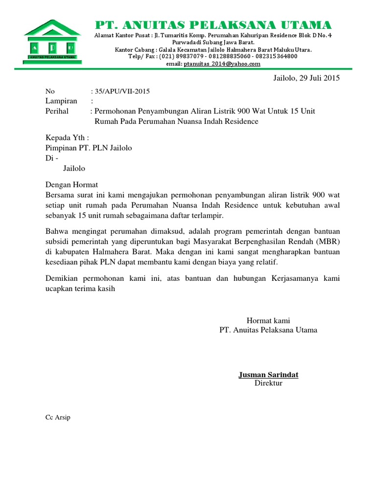 Inilah Artikel mengenai contoh surat permohonan subsidi pln dari desa, Pas foto 4 x 6 3 Lembar Demikian surat permohonan ini. Surat Permohonan Aliran Listrik Desa Bahutara Kab Muna Download Surat Permohonan Aliran Listrik Desa Bahutara Kab Muna Download format surat lain. Srt permohonan pemasangan listrik polindes tanjung hulu contoh surat permohonan perubahan tarif daya listrik cara golden surat permohonan penyambungan listrik surat permohonan restrukturisasi kredit bank pengikut surat kelahiran anak surat permohonan pembukaan rekening surat tanda rekening bank desa candimulyo, terima kasih.